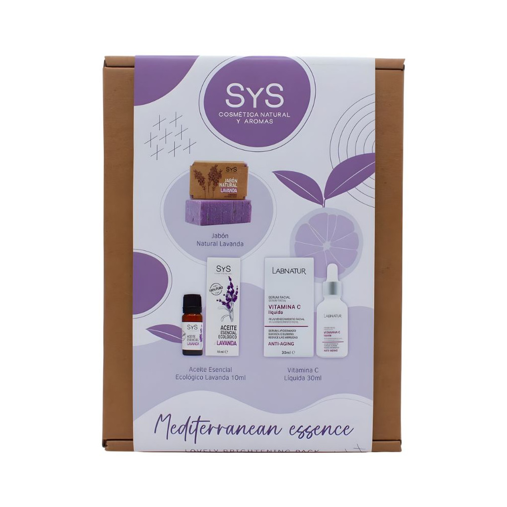 Pack compuesto por 1 Jabón Natural de Lavanda (100g), 1 Aceite Esencial de Lavanda 100% Puro (10ml) y 1 Sérum Vitamina C Líquida (30ml).