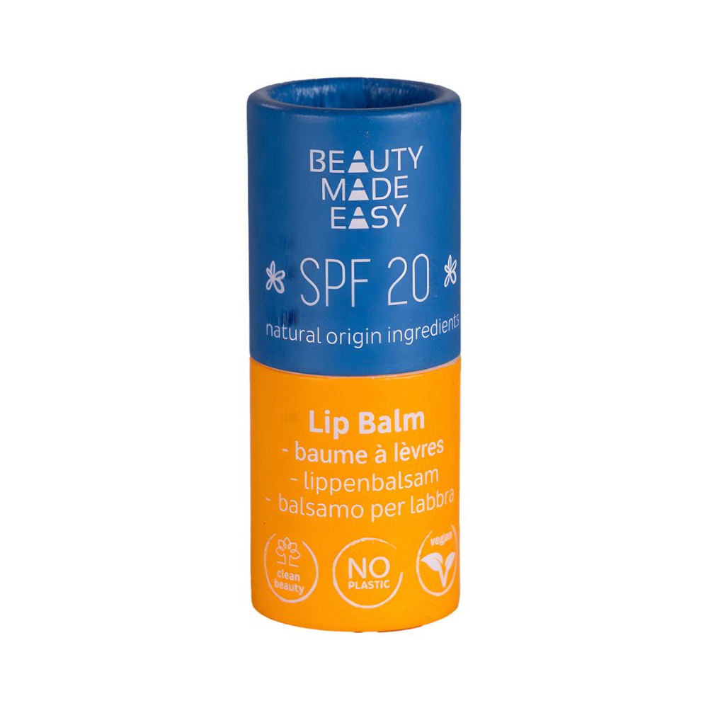 Bálsamo labial solar de 5,5 gramos en tubo de cartón reciclable.