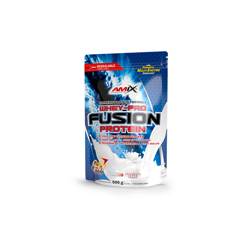 Whey Pro Fusion 1:1 Protein Complex 80 % (concentrado de Proteína de Suero /de leche/instantánea Ultra Filtrada a baja temperatura, CFM Proteína Aislada deSuero con fracciones de proteínas de la leche[beta-lactoglobulina, alfa-lactoglobulina, seroalbúmina, inmunoglobulina, glicomacropéptido, lactoferrina,l actoperoxidasa]); estabilizante: colágeno hidrolizado; maltodextrina, cacao en polvo (solo en sabores: chocolate, chocolate-coco, cacahuete-choco-caramelo, moca-chocolate-café), emulgente: lecitina desoja; aroma, estabilizante:carboximetilcelulosa sódica; edulcorante: Splenda sucralosa y acesulfamo-K; colorante: (sabor plátano-curcumina; sabor piña colada: curcumina; sabor pistachos, melón-yogur y manzana y canela-clorofilina de cobre); rojo de remolacha (solo sabores fresa, frutas del bosque y piña colada), enzimas digestivas patentadas DigeZyme-multicomplejo enzimático (amilasa, lipasa, lactasa, celulasa, proteasa bacteriana neutra), cacao en polvo (solo en sabores: cookies cream, doble chocolate blanco), cloruro de sodio.