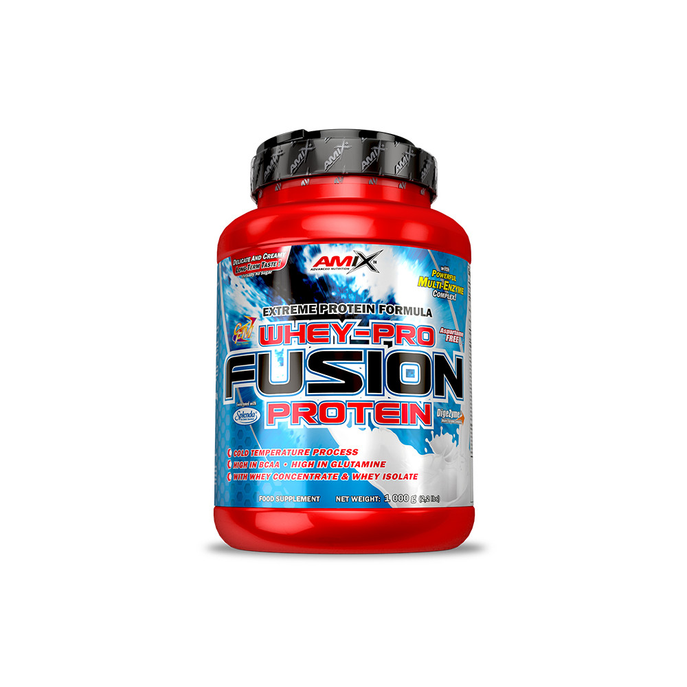 Whey Pro Fusion 1:1 Protein Complex 80 % (concentrado de Proteína de Suero /de leche/instantánea Ultra Filtrada a baja temperatura, CFM Proteína Aislada deSuero con fracciones de proteínas de la leche[beta-lactoglobulina, alfa-lactoglobulina, seroalbúmina, inmunoglobulina, glicomacropéptido, lactoferrina,l actoperoxidasa]); estabilizante: colágeno hidrolizado; maltodextrina, cacao en polvo (solo en sabores: chocolate, chocolate-coco, cacahuete-choco-caramelo, moca-chocolate-café), emulgente: lecitina desoja; aroma, estabilizante:carboximetilcelulosa sódica; edulcorante: Splenda sucralosa y acesulfamo-K; colorante: (sabor plátano-curcumina; sabor piña colada: curcumina; sabor pistachos, melón-yogur y manzana y canela-clorofilina de cobre); rojo de remolacha (solo sabores fresa, frutas del bosque y piña colada), enzimas digestivas patentadas DigeZyme-multicomplejo enzimático (amilasa, lipasa, lactasa, celulasa, proteasa bacteriana neutra), cacao en polvo (solo en sabores: cookies cream, doble chocolate blanco), cloruro de sodio.