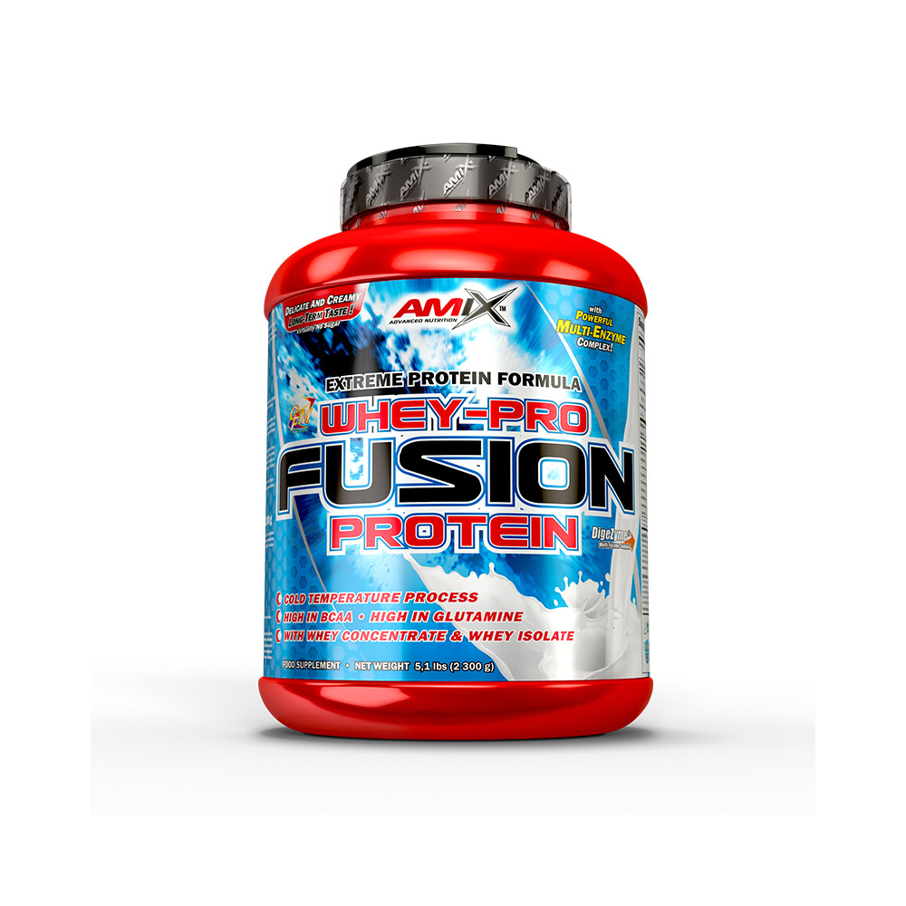 Whey Pro Fusion 1:1 Protein Complex 80 % (concentrado de Proteína de Suero /de leche/instantánea Ultra Filtrada a baja temperatura, CFM Proteína Aislada deSuero con fracciones de proteínas de la leche[beta-lactoglobulina, alfa-lactoglobulina, seroalbúmina, inmunoglobulina, glicomacropéptido, lactoferrina,l actoperoxidasa]); estabilizante: colágeno hidrolizado; maltodextrina, cacao en polvo (solo en sabores: chocolate, chocolate-coco, cacahuete-choco-caramelo, moca-chocolate-café), emulgente: lecitina desoja; aroma, estabilizante:carboximetilcelulosa sódica; edulcorante: Splenda sucralosa y acesulfamo-K; colorante: (sabor plátano-curcumina; sabor piña colada: curcumina; sabor pistachos, melón-yogur y manzana y canela-clorofilina de cobre); rojo de remolacha (solo sabores fresa, frutas del bosque y piña colada), enzimas digestivas patentadas DigeZyme-multicomplejo enzimático (amilasa, lipasa, lactasa, celulasa, proteasa bacteriana neutra), cacao en polvo (solo en sabores: cookies cream, doble chocolate blanco), cloruro de sodio.