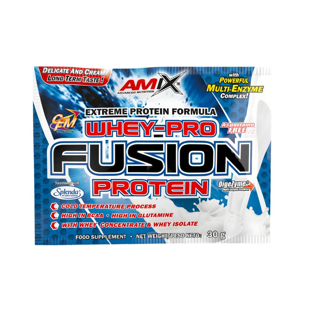 Whey-Pro Fusion 1:1 Protein Complex 80 % (concentrado de suero de proteína de suero de leche instantánea ultra filtrada a baja temperatura, CFM aislado de proteína de suero de leche con fracciones de proteínas de la leche (beta-lactoglobulina, alfa lactoglobulina, seroalbumina, glicomacropeptido, lactoferrina y lactoperoxidasa); estabilizante: colageno hidrolizado, maltodextrina, emulgente: lecitina de soja, aroma, estabilizante: carboximetilcelulosa sodica; edulcorantes: sucralosa Splenda® y acesulfamo K, enzimas digestivas patentadas Digezime-complejo multienzimatico (amilasa, lipasa, lactasa, celulasa, y proteasa bacteriana neutra), cloruro de sodio.