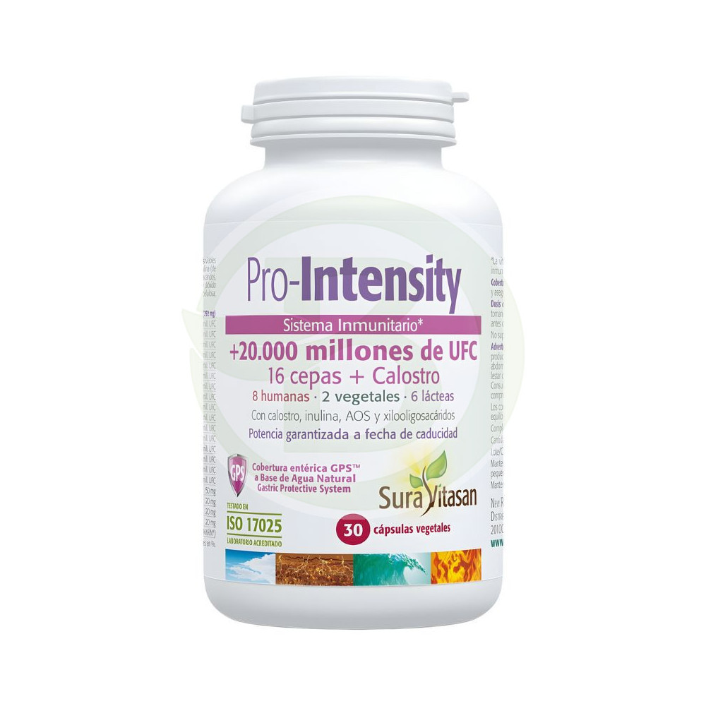 Cultivo de bacterias (20.000 mill. de microorganismos viables por cápsula, ver información nutricional) (en contacto con leche y soja), calostro bovino (de Bos taurus), inulina (de raíz de achicoria, Cichorium intybus), arabinogalactano (de Larix laricinia), antiaglomerante (dióxido de silicio), cápsula vegetal entérica PH5D (agente de recubrimiento: hidroxipropilmetilcelulosa; solución acuosa para la protección entérica; agua purificada).