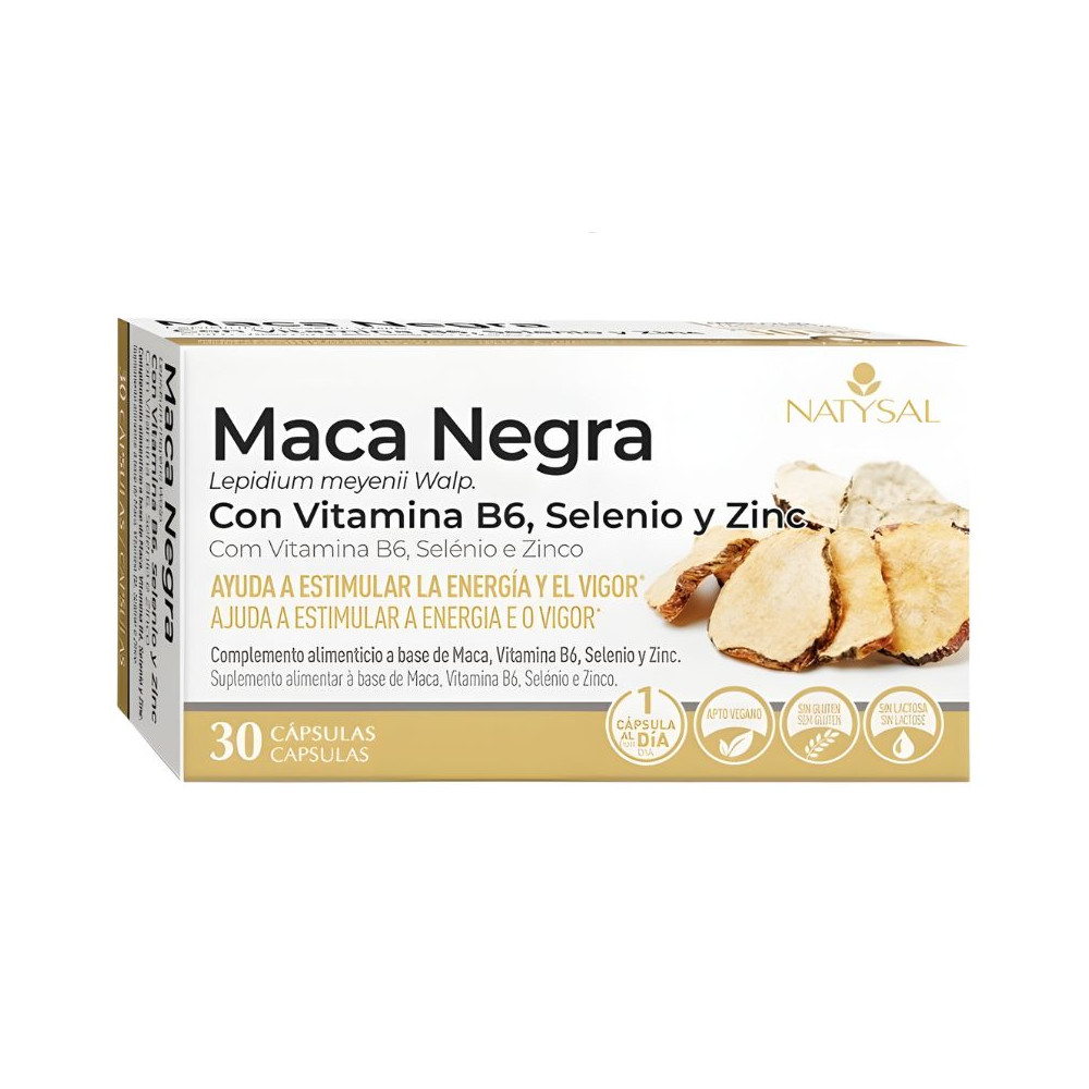 Raíz de maca negra en polvo (Lepidium meyenii Walp.), extracto seco de raíz de maca (Lepidium meyenii Walp.) con un ratio 10:1, cubierta de la cápsula: hidroxipropilmetilcelulosa, picolinato de zinc, antiaglomerante estearato magnésico vegetal, vitamina B6 (clorhidrato de piridoxina), selenito de sodio.Modo de Empleo: