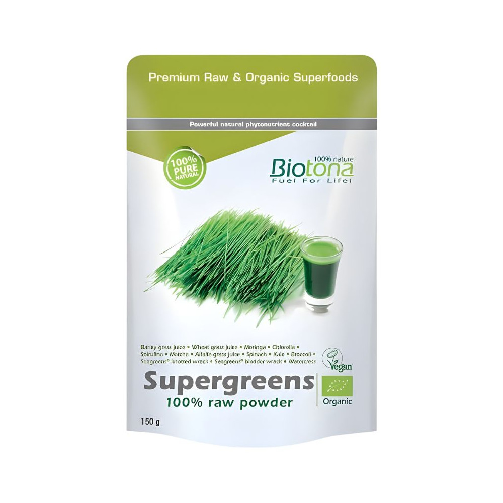 Polvo (100%) de jugo de hierba de cebada*, jugo de hierba de trigo*, moringa*, matcha*, jugo de hierba de alfalfa*, col rizada*, espinacas*, brócoli*, chlorella*, espirulina*, Seagreens® alga goèmon* y alga fucus*, berro*.